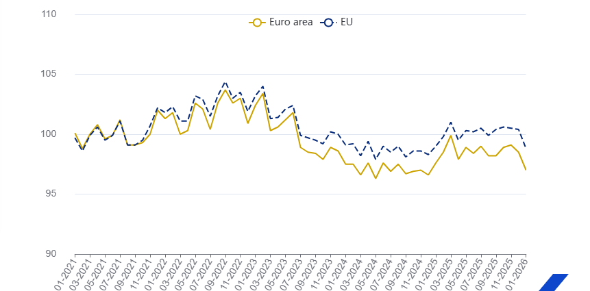 Industrial production weakened in the euro area and in the EU in January. According to first estimates from Eurostat, industrial production fell 1.2% year‑on‑year in the euro area and 0.6% in the EU. On a month‑on‑month basis, seasonally adjusted industrial production declined 1.5% in the euro area and 1.6% in the EU.