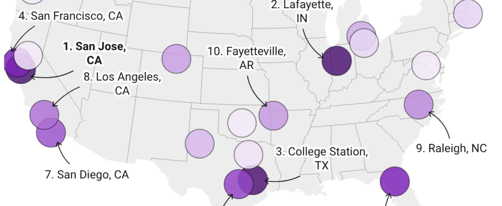 Texas contributes four metros as well. College Station, Texas, places third at 93%, driven by Texas A&M University’s enrollment expansion. Austin, Texas, ranks sixth at approximately 92%. College-town Lafayette, Indiana, is the runner-up at 94%, while Raleigh and Ann Arbor, Michigan, each show nine of 10 Gen Z households renting.
