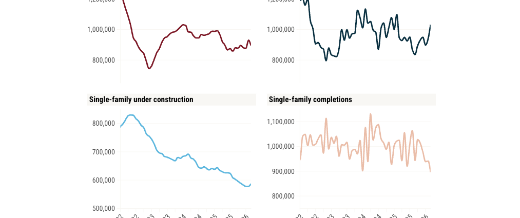 Single-family completions also slowed by 14.5% compared with March 2025, and multifamily completions slowed down by 9.1%. Put together, total completions were down 13.5% on an annual basis.