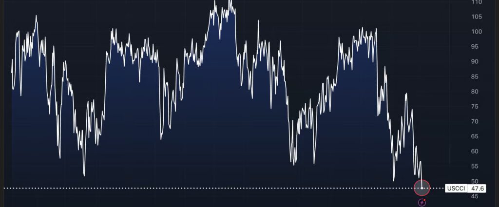 The preliminary April consumer sentiment index crashed to 47.6 — an all-time record low, an 11% monthly plunge and a sharp miss against the 52 consensus — as the Iran war’s economic fallout spread from the gas pump into households’ broader outlook on their finances, jobs and the future.