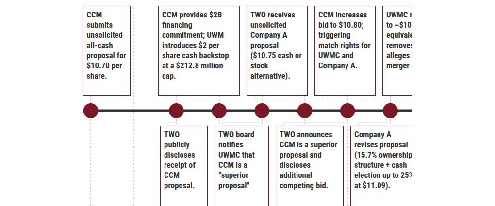 Still, the TWO board said the final value remained uncertain because it depended on UWM’s 10-day average stock price before closing rather than the actual closing-day price. Shareholders would need to sell UWM shares in the open market to realize the full cash value. The board also accused UWM of limited engagement regarding potential synergies.