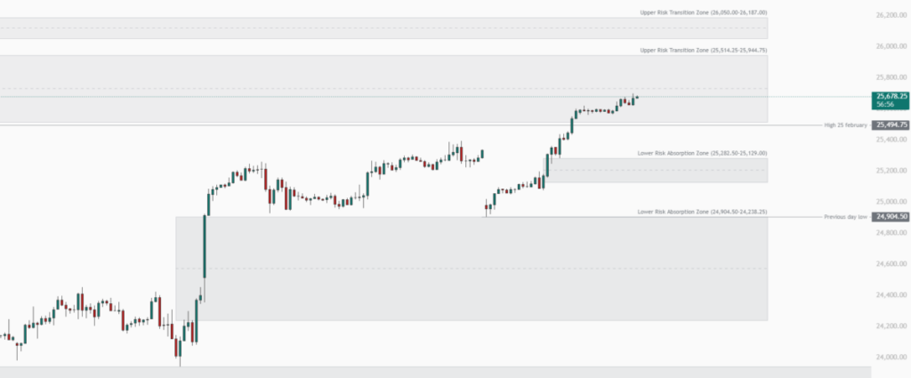 The Nasdaq (NQ) and S&P 500 (ES) continue to trade within an upward trajectory, with price currently testing a key resistance zone. Market volatility and liquidity dynamics remain central, as both indices interact with clearly defined support and resistance levels. This environment highlights the importance of observing how price responds within these zones rather than anticipating directional outcomes.