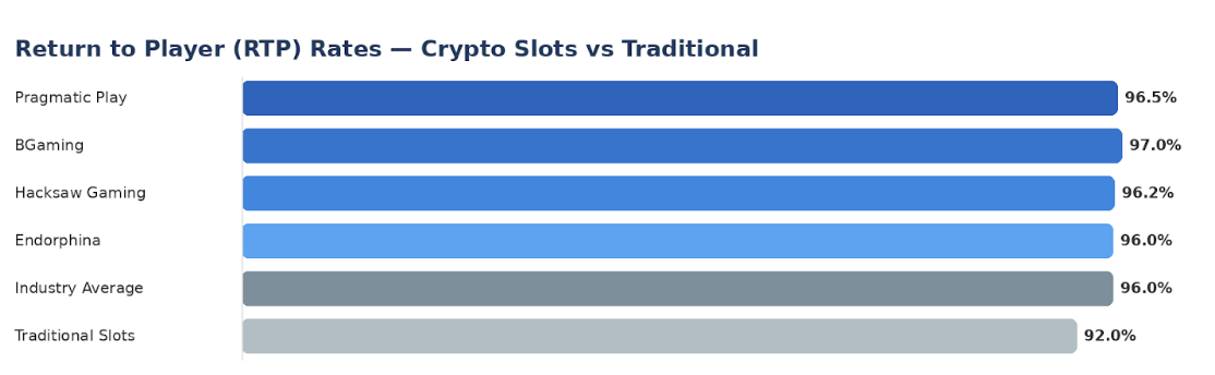 Crypto slots from reputable game providers like Pragmatic Play, BGaming, Hacksaw Gaming, and Endorphina typically offer RTPs between 94% and 97%, which is consistent with the broader online slots industry. Players should be wary of platforms that do not disclose RTP figures or that run proprietary games with no independent audit data.