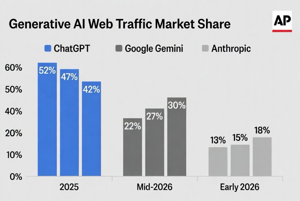The competitive dynamics have shifted measurably. ChatGPT’s share of generative AI web traffic dropped from 86.7% a year ago to 64.5% in January 2026, while Gemini rose sharply from 5.7% to 21.5%. The company also grappled with subscriber defection rates.
