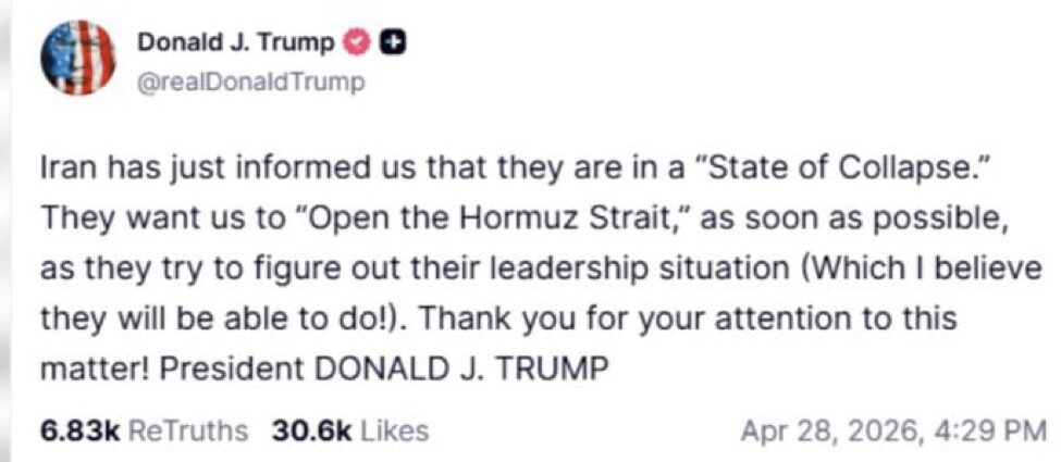 US President Donald Trump claimed that Iran has informed him that they are in a “state of collapse” as they figure out their leadership situation, in a post on Truth Social on Tuesday.