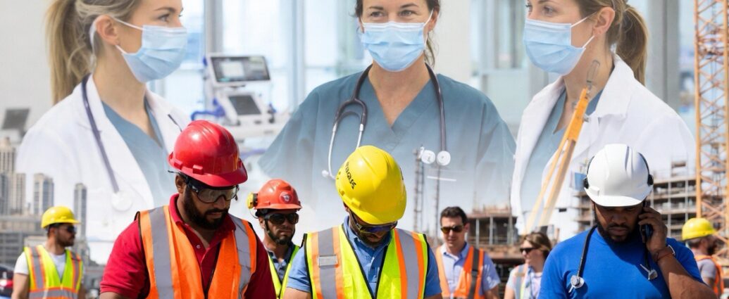 Realistic AP photojournalism style: diverse group of American workers on a busy construction site and in a modern healthcare facility, showing active hiring and daily labor environment, natural daylight, documentary news aesthetic, high resolution, no text or brandinglandscape