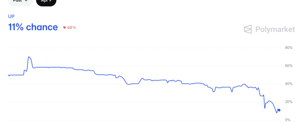 However, the Polygon-based (CRYPTO: POL) Polymarket crowd has turned bearish heading into Thursday. The April 9 market shows a majority of traders betting “Down,” and only 11% “Up,” following $144,916 in traded volume on the April 8 outcome, where sentiment stayed firmly tilted toward gains.