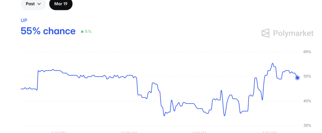 The Polygon-based (CRYPTO: POL) Polymarket crowd is bearish heading into Thursday. The “S&P 500 Opens Up or Down on March 19?” market sits at 55% “Down,” 45% “Up,” with over $54,000 in early traded volume.